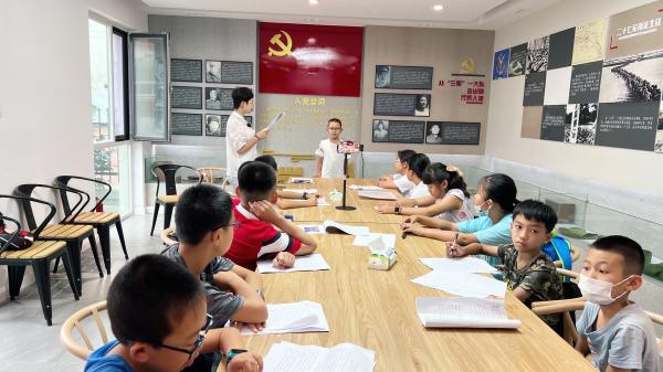 2022年8月13日上午九时,大雨也不能阻止孩子们学习的热情,李翠翠老师为小小讲解员们进行了第3次培训,孩子们大多能脱稿讲解了,但是在情感表达、断句上面还有欠缺,翠翠老师精益求精,又一个一个的进行指点。三位老党员讲解员的岁数加起来超过200多岁了,也跟孩子们一起认真听讲,悉心练习。