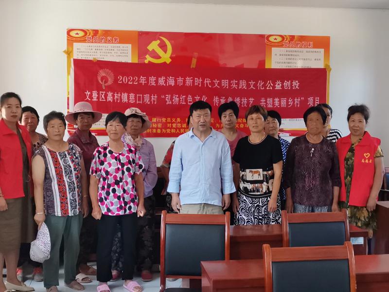 2022年7月13日上午、下午在文登区高村镇慈口观村村委活动室组织开展了高村镇部分党员及慈口观村村民项目启动及党史宣传教育为主题的讲座及刺绣工艺流派及其特色。7月16日上午、下午在文登区高村镇慈口观村村委活动室组织慈口观村民练习绣制红色题材书包针法。